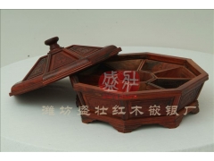 【公司介紹】:紅木嵌銀是濰坊四寶之一,作為獨(dú)特的民間工藝品已有近二百年的歷史,在全國乃至全世界都是獨(dú)一無二的。因其風(fēng)格獨(dú)特做工考究而被譽(yù)為“天下一絕”。所謂“嵌銀”顧名思義,就是把金銀絲鑲嵌在名貴木材的木料里,經(jīng)過十幾道工序后,顯現(xiàn)出花紋圖案,從而提高了產(chǎn)品的特色。紅木嵌銀漆器以其典雅古樸、秀美飄逸的獨(dú)特風(fēng)格,愈來愈受到人們的青睞。在今天人們越來越崇尚中國傳統(tǒng)文化和古典家具藝術(shù)的潮流下,紅木嵌銀漆器已成為國內(nèi)外收藏的熱點(diǎn)。