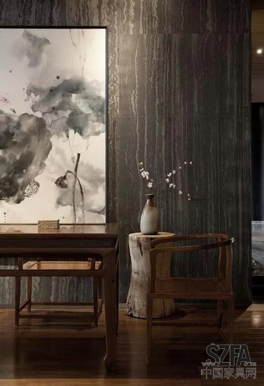 二樓展示廳設計師以「回歸」、「內省」的出發點,選擇寧靜、樸實的人文禪風,廳內僅擺著一件根雕,整面六米的墻面上則是用來投影展示。