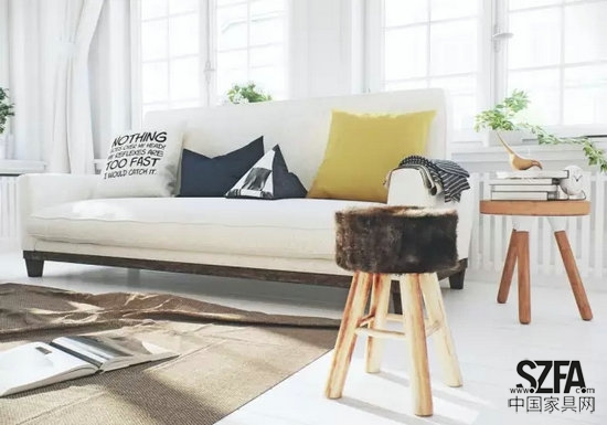 白色沙發上擺放著各式各樣的靠枕,木制高腳凳上的絨毛座套倍感溫馨,清新的小綠植與陽光和諧統一。