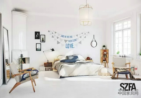 墻壁上大大的“Love”字樣讓人覺得暖心,舒適的沙發椅、床邊的整理箱和角落的擺件都讓臥室顯得隨意休閑。并不顯眼的壁爐足夠溫暖,木材整齊地堆砌在地上,增加了濃郁的生活氣息。