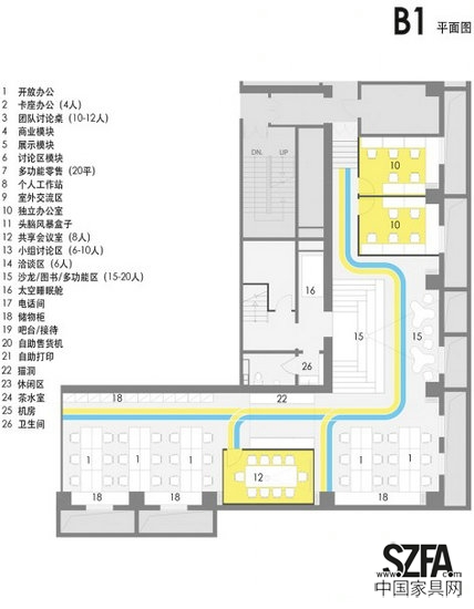 在辦公空間中,地下層往往會因為其交通方式的不便而具有劣勢,在遠洋新干線We+項目中,為了避免地下空間的不便,建筑師將通往地下的樓梯間整體噴成了明快的黃色,在具有強烈引導性的同時也激發了原本消極空間的活力。明黃色的樓梯間在地下層出口處打開,形成大臺階,作為該聯合辦公空間為入駐團隊提供的小型宣講和活動發布場地。地下層的公共部分還設置了“貓洞”空間和“睡眠艙”空間,供入駐團隊交往、放松和短時休憩所用。