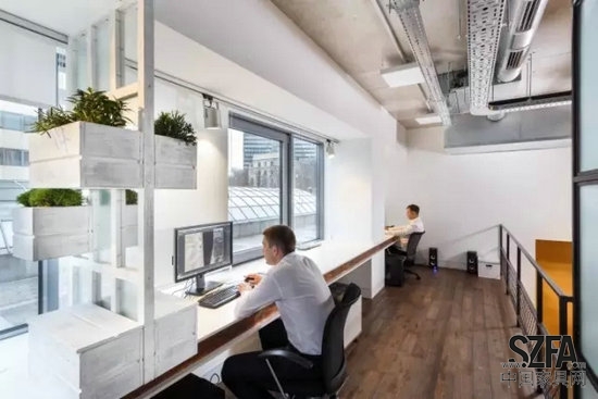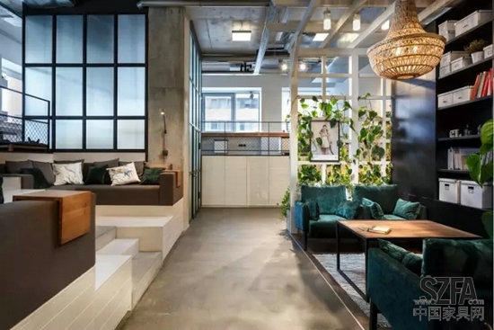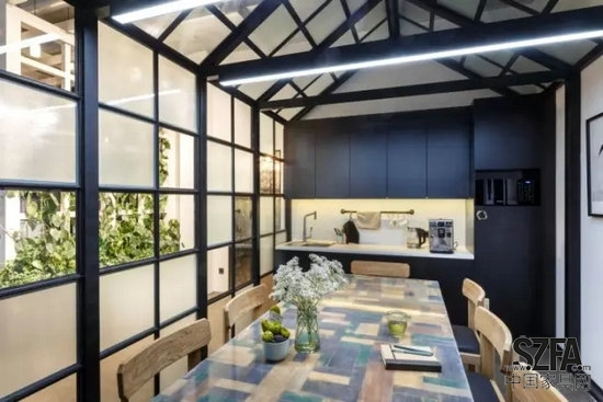因為空間的高度足夠高,設計師就勢采用了一種屋中屋的設計方案。例如,廚房被安置在玻璃房里,而休息區的位置則在藤架做成的綠廊下面。休息區的周圍都是高大的綠葉植物,坐在這里就好像是呆在城市花園里一樣。用金屬框架和不同種類的玻璃做成的玻璃房,既具有一定的造型,又顯得清晰明朗。