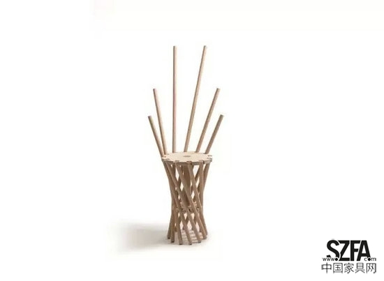紐約設(shè)計師 jongyoon choi 用 12 根木棍和兩塊激光切割的圓板組成了這把椅子,巧妙的是它們沒有使用釘子之類的物品固定,而是將木棍傾斜,插進(jìn)木板的空缺,以此達(dá)到一種巧妙的平衡。如果木棍完全切割成一樣的長度,它就是一把凳子。所有木棍按照一個方向傾斜,讓它有了律動和旋轉(zhuǎn)的感覺,很活潑。但總覺得更適合放在服裝商店的角落做裝飾。