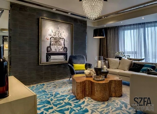地毯上造型各異、大小不等的飛鳥圖騰和以云朵為造型的茶幾,是邱德光為這空間添入的夢幻的想象;以明式座椅為主題的藝術畫作,則是加入了懷古的東方情韻。