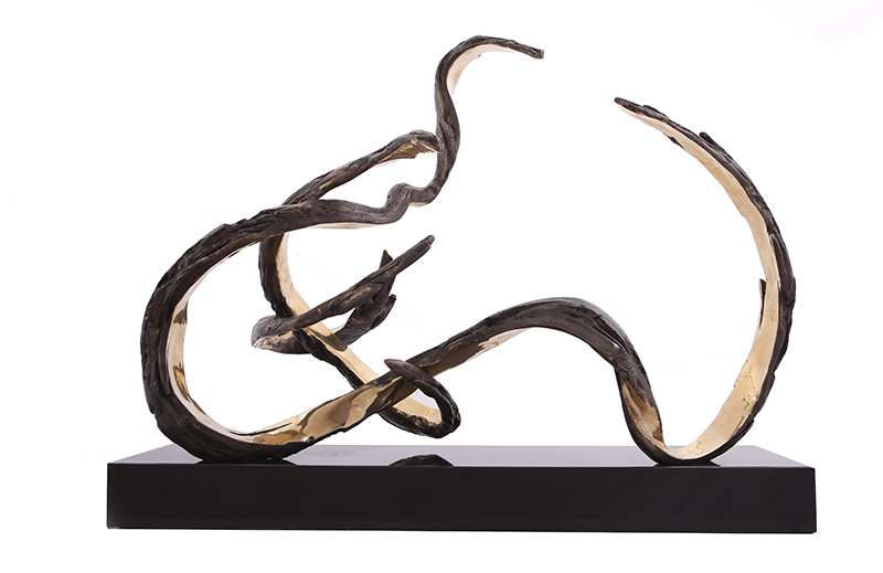 那特墨韻系列,主要包含以墨為主的墨形、墨色、墨韻以及書(shū)法等意象。以書(shū)法為主的取象、道、勢(shì)、韻幾個(gè)方面入手,以狂草的意蘊(yùn)為背景,主取“飛動(dòng)之勢(shì)”、靈性揮灑的特點(diǎn)加以立體的演化,構(gòu)成突出其形式美的純抽象雕塑和壁飾。它們或粗或細(xì),或澀或潤(rùn),或急或緩,或靜或動(dòng),或隱或現(xiàn)......金屬線條的肆意流動(dòng)飛舞卻充滿著張力,有如音樂(lè)的境界,時(shí)空合一,傳達(dá)出生命的意象。