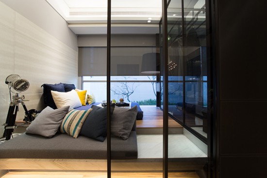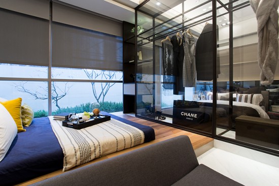 靠墻的衣柜背墻具有穿透性的強化玻璃,隔而不分兩個空間,房間頓時放大且明亮;而在需要隱私的時候,再利用可以隔絕視覺的卷簾或百頁來分隔,空間的利用性就可以大大的增加,而衣柜本身的深度和前后面板雙層強化玻璃的隔音,在實用性上達到加成效果,這就是設計師在每一個空間交界中想要探討的議題模式:是不是能讓每個平面的交界墻面,都能夠達到最高利用率。