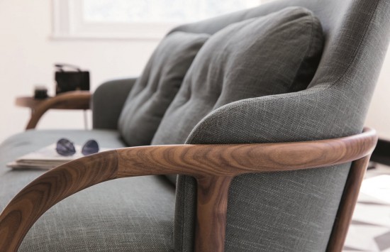 Sofa with frame in solid canaletta walnut and removable cover in the fabrics of the collection. Two feather filled back cushions included. It is possible to combine different fabrics for seat and cushions.