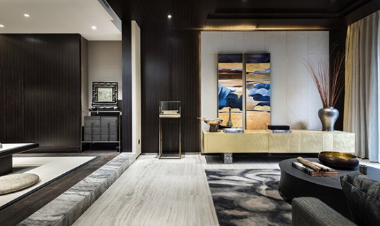 順著樓梯循級(jí)而下,6米長(zhǎng)的云石吊燈光影如泄,石屏上幻化的肌理,猶如一幅幅精美山水畫,順著山水的紋路,透出朦朦朧朧的光如數(shù)千年的文化長(zhǎng)河,傾瀉于底下的一組太湖石之上。