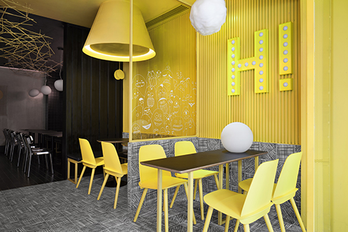 Design concept is derived from the outbreak of cool feeling when we use tube to drink carbonated soft drinks in our childhood. The sweet, gassy liquid goes into our month instantaneously and goes deep through our esophagus, and then a “belch” is made, this cool feeling is our biggest satisfaction as a child. Indoor space of the site is a rectangle space which is built mainly by connecting two space blocks-a yellow box and a black box. The ceiling is decorated with tube element which extends from the entry to the deepest interior space and connects the yellow box and black box .It reaches the deepest place of the space, just like the burst of taste and texture when we drink soft drinks. Blocks of the floor and wall use encaustic tiles with sketch, which makes visitors remember how it felt like doodling circles on paper during their boring school days. The combination of the two blocks and ceiling, and the interweaving of spaces, together with the decoration of simple but strange monster dolls design and fashionable dolls; a space which could make customers recall the past is created. The whole atmosphere keeps customers’ spirits up and increase subconsciously customers eating speed. Guest flow of the store is increased in this way, and such design fits the business operating mode of today’s fashionable food and beverage space.