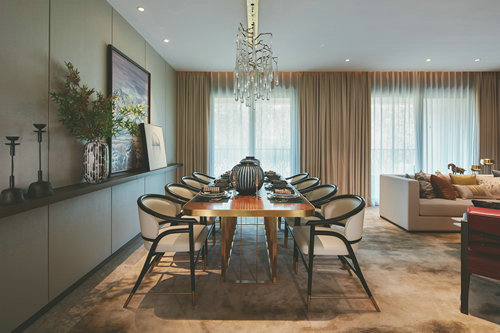 新中式,當下時代的議題,東方的豐富細膩,以現代的方式詮釋,將生活形態和美學意識轉化成一種無聲卻可以感知享受的設計語言。對于意境氛圍的營造,設計師從細節入手,餐廳的掛畫、花藝綠植、擺件,組合成意境小景,賦予日常生活審美情趣。